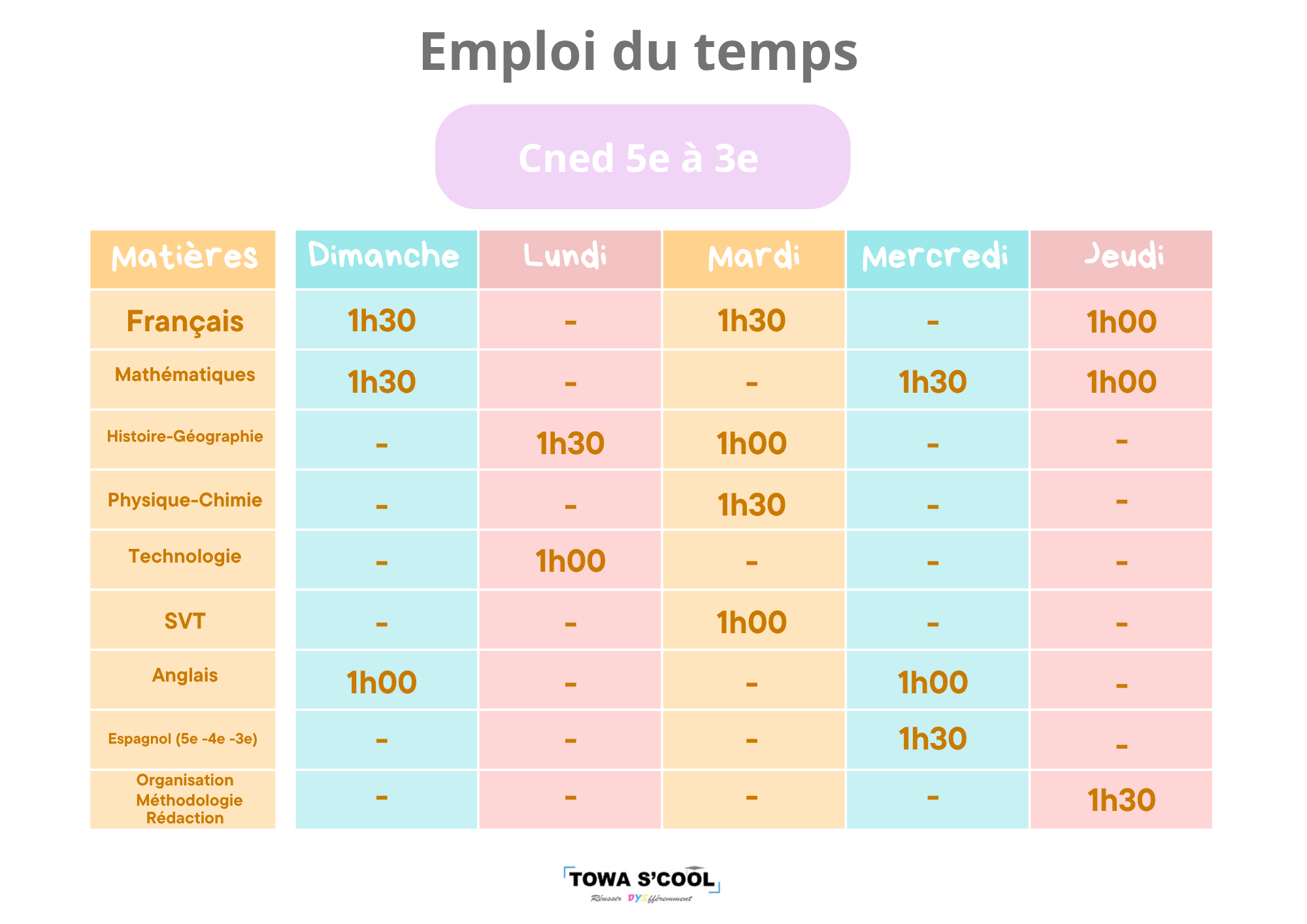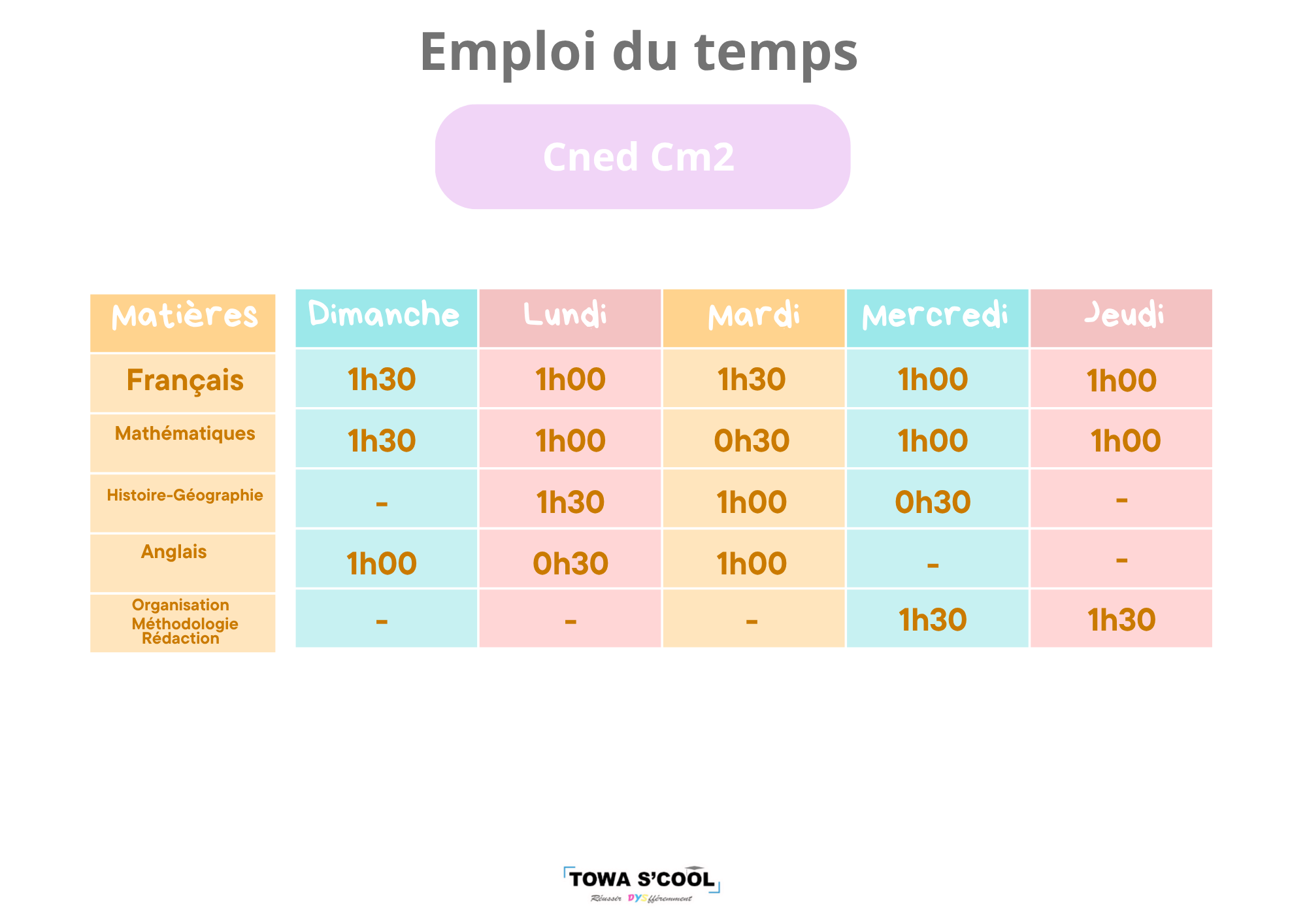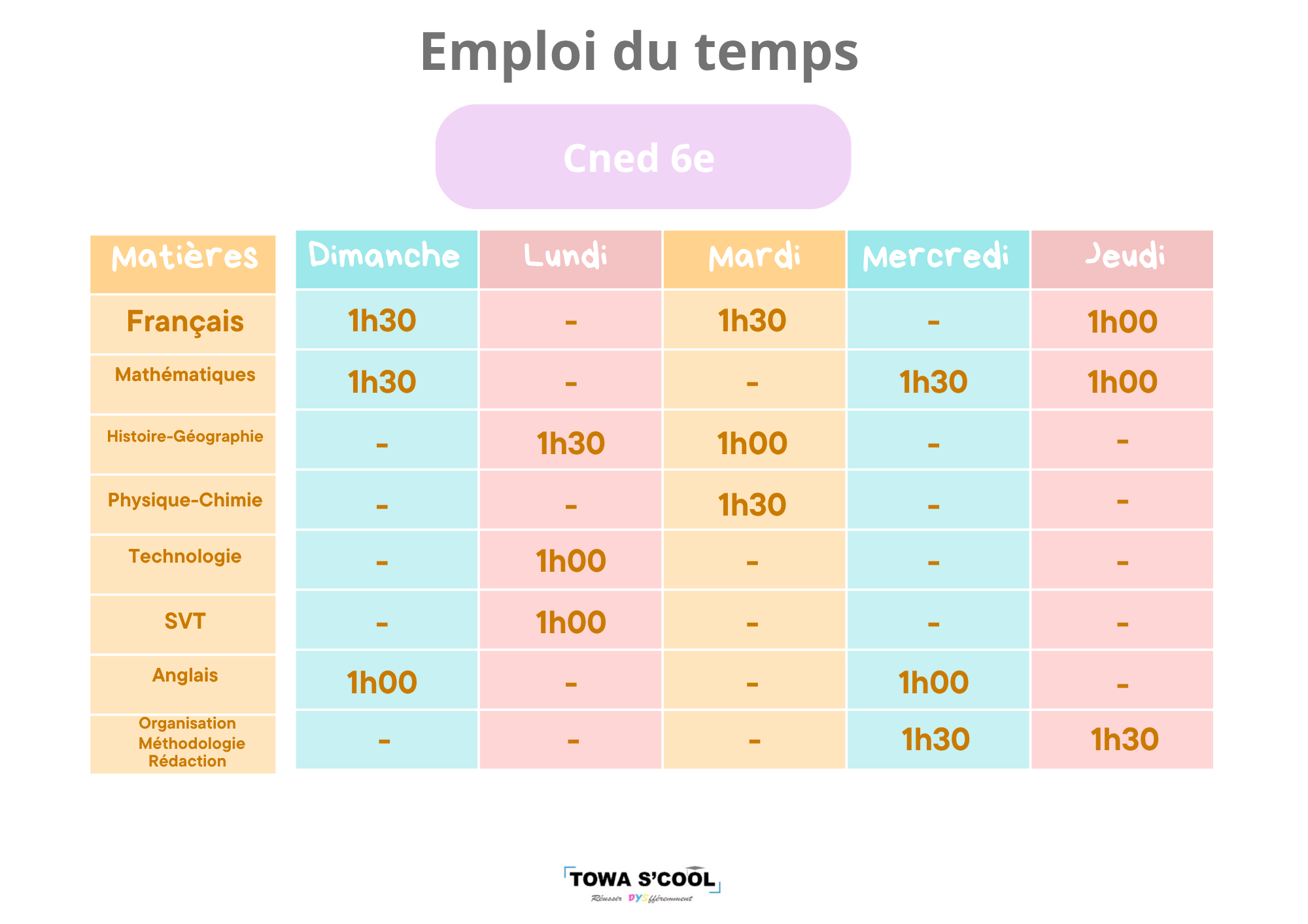 Le temps de travail est organisé autour des matières principales du programme du CNED (français, mathématiques, histoire-géographie, sciences, langues), ainsi que de temps spécifiques consacrés à la méthodologie, à l’organisation du travail, à la rédaction et au suivi du travail scolaire.