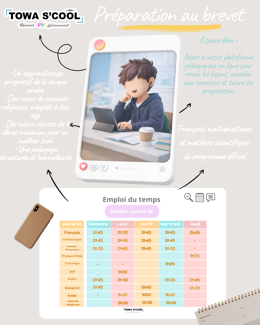 Dès la quatrième, Towa S’cool met en place des séances hebdomadaires dédiées à la préparation du brevet, organisées autour d’une rotation sur les quatre matières clés : français, mathématiques, histoire-géographie et sciences.