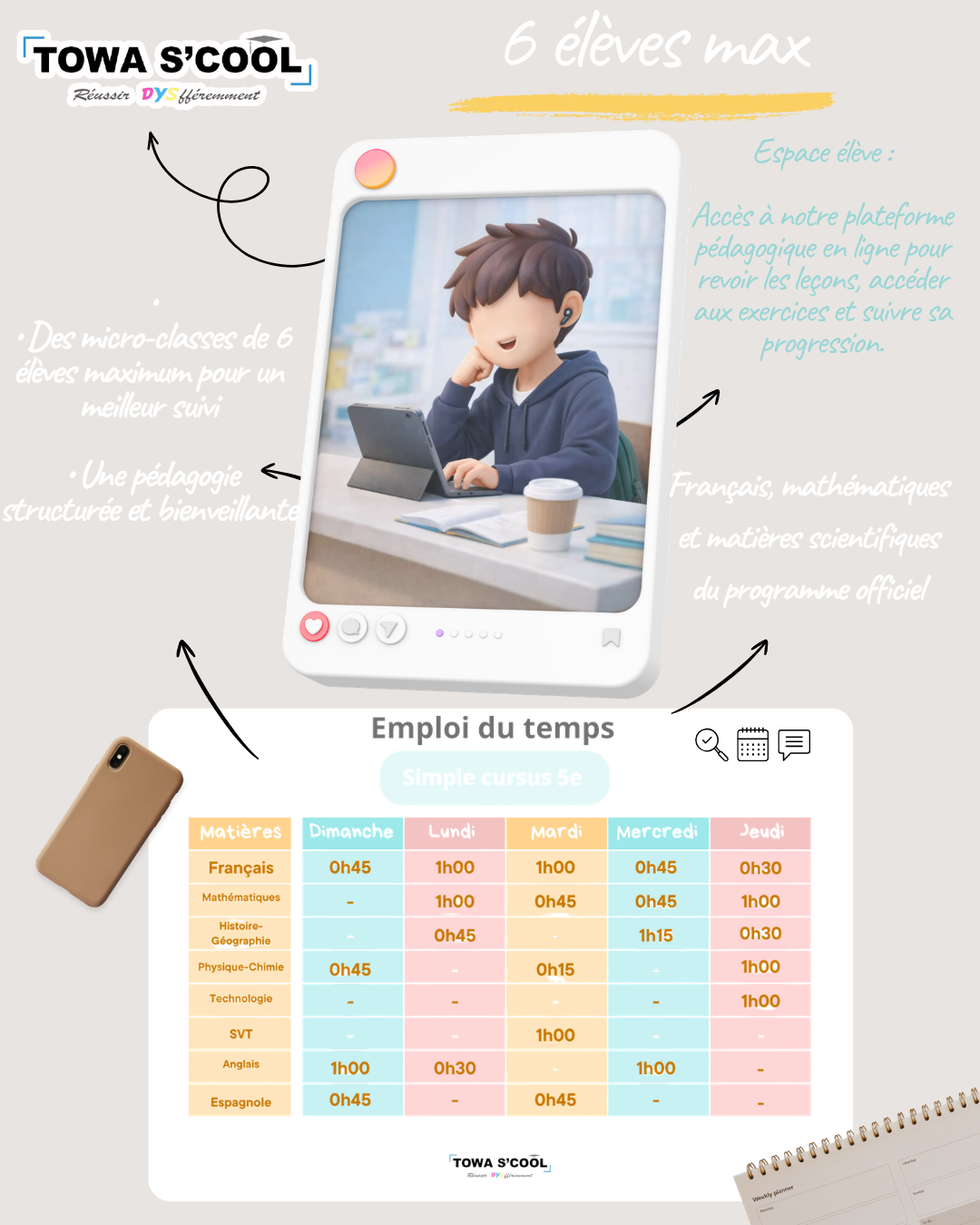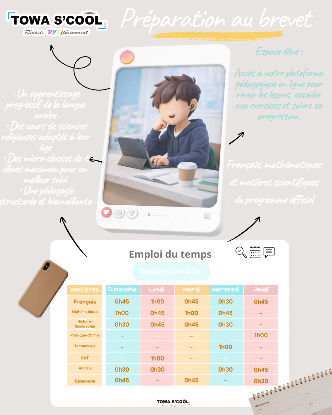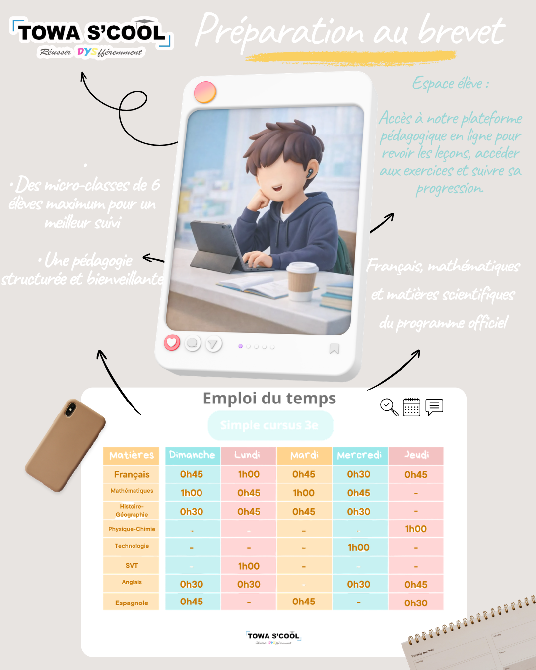 Dès la quatrième, Towa S’cool met en place des séances hebdomadaires dédiées à la préparation du brevet, organisées autour d’une rotation sur les quatre matières clés : français, mathématiques, histoire-géographie et sciences.