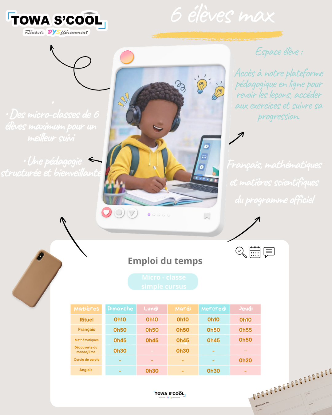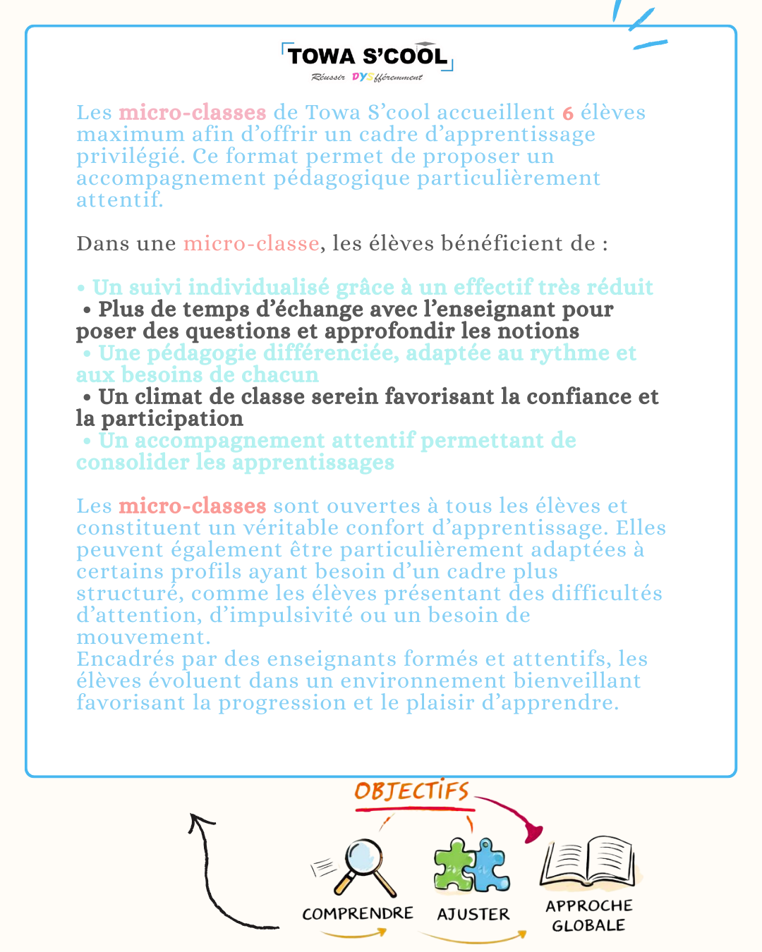 La micro-classe primaire aménagée chez Towa S’cool est un dispositif pédagogique conçu pour permettre à tous les élèves d’atteindre les compétences attendues du primaire, en tenant compte de la diversité des profils et des besoins. Les objectifs d’apprentissage sont communs à l’ensemble des élèves. Ce qui varie, ce sont les stratégies pédagogiques mises en place pour y parvenir. L’enseignant adapte ses méthodes, ses supports et son accompagnement en fonction du fonctionnement de chaque enfant, afin de lever les obstacles éventuels aux apprentissages.